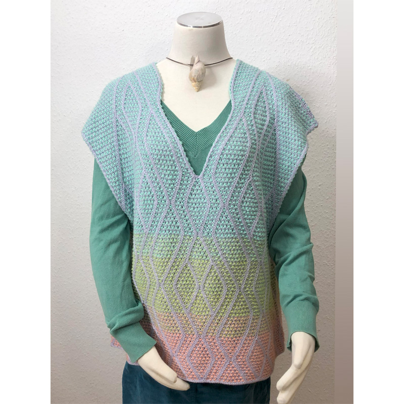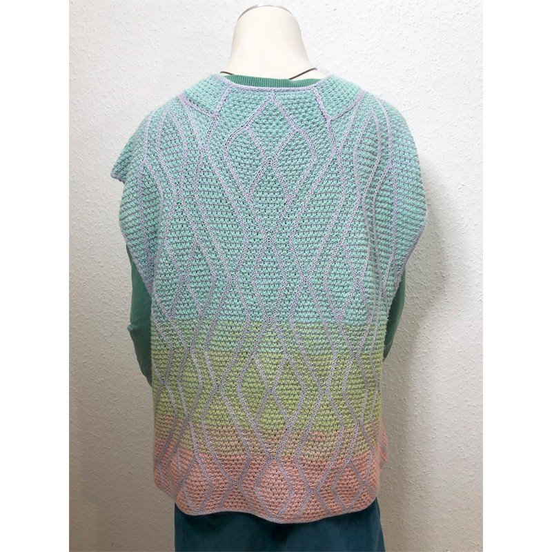 Inzwischen gibt es die Weiterentwicklung des Musters mit hellen und dunklen Musterabschnitten pro Seite, dazu seht Ihr hier den „Pink Waves“ Schal. Es bleibt dabei leichtgewichtig. Zur Entstehung des Musters habe ich inzwischen eine Ausstellung zusammengestellt: „Ist vorne vorn, oder doch hinten ?“.