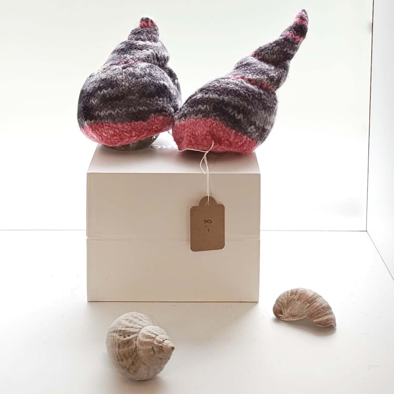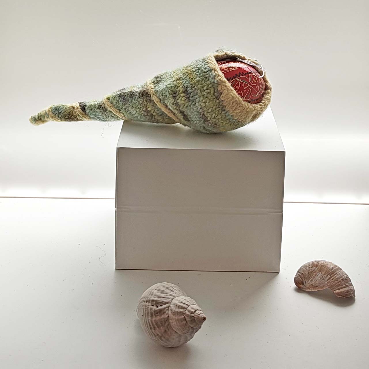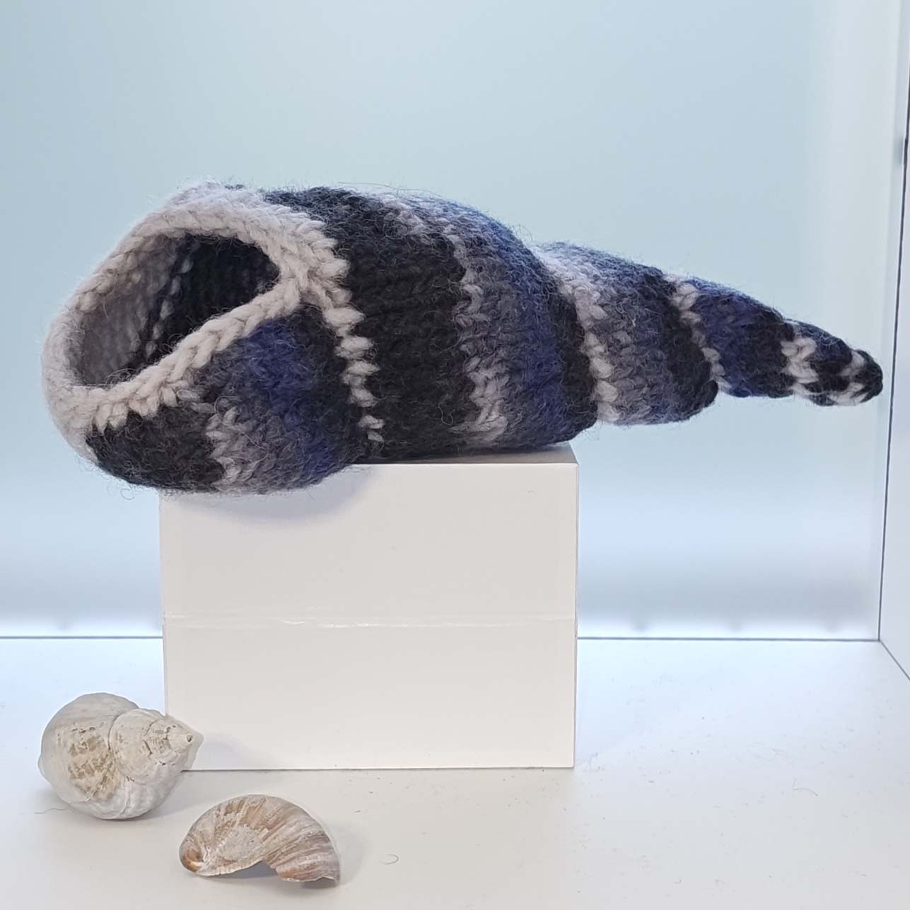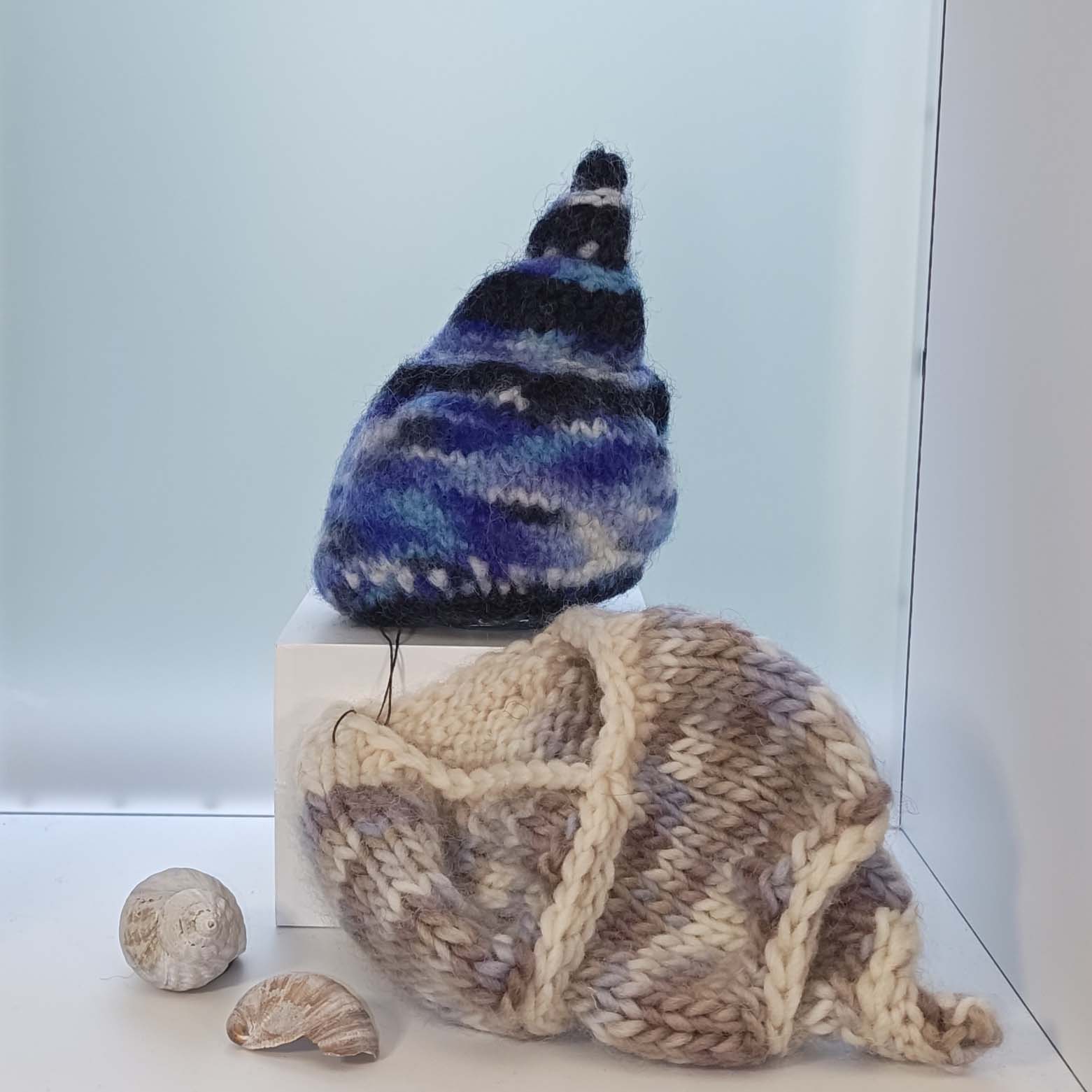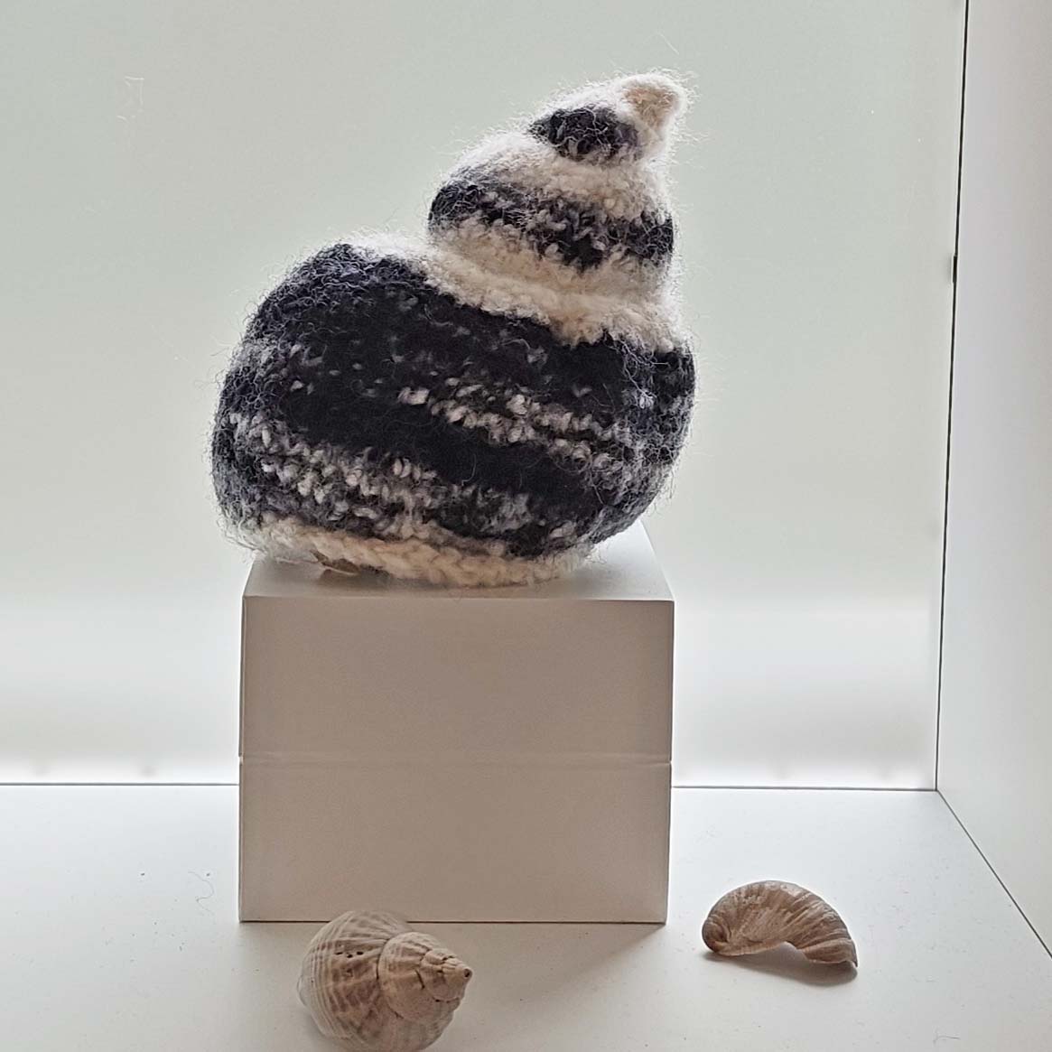 Für die Ausstellungen habe Euch einige „Buccinidae & Turritella“ (Wellhorn- und turmförmige Schnecken)“ gestrickt – in der Größe vom wunderbaren kleinen Handschmeichler oder kleinen Deko-Objekt in Größe XS, über Eierwärmer zu größeren kuschligen Schmückern. Einige passen auch in einen Bilderrahmen, wie Ihr das bei den Lana Cochlea an anderer Stelle sehen könnt.