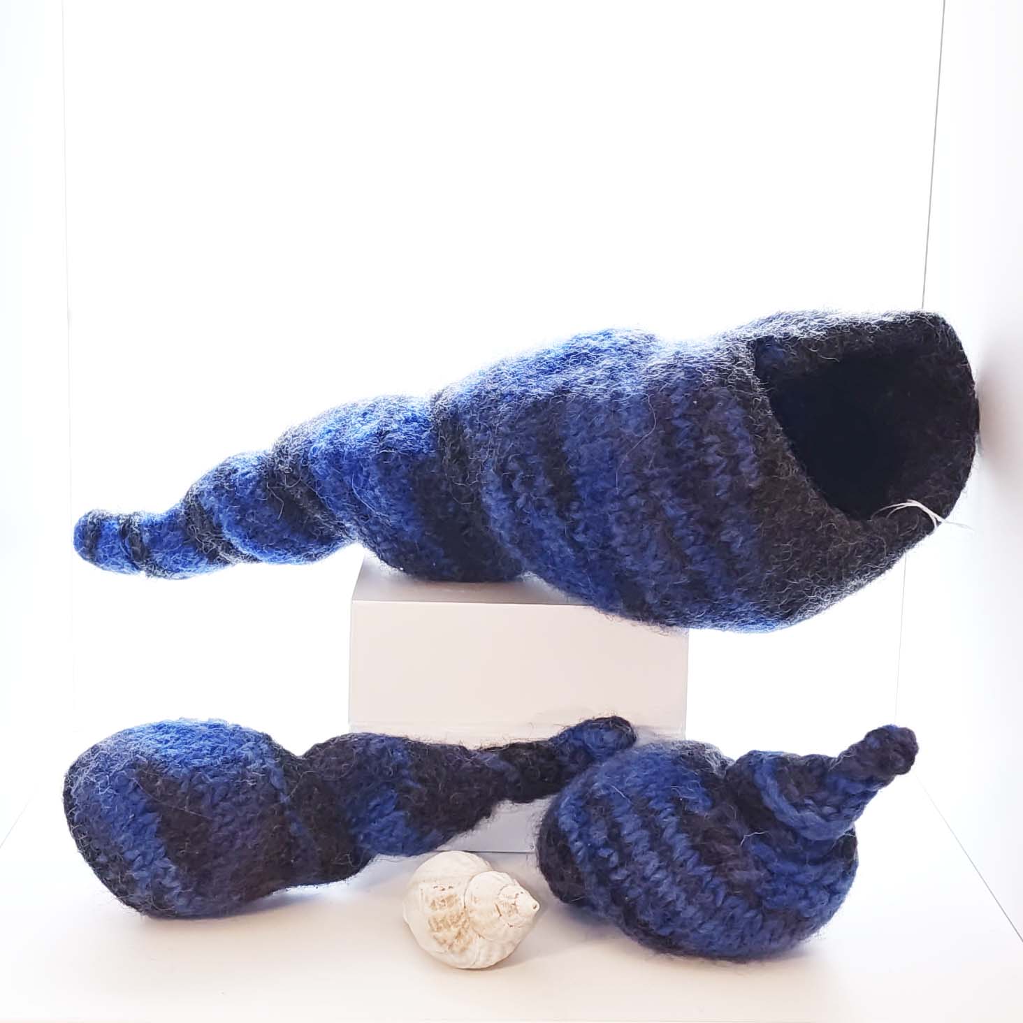 | Verschiedene "Spiral-Cochlea" | Turritella "Nordsee", Turritella "kleine Nordsee", Turritella-Familie blau-anthrazit, Eierwärmer "Michels" grau, Eierwärmer Worsted "grau-bunt", Eierwärmer "Chunky" fuscia, Eierwärmer Pärle Worsted "schwarz-rosa", Pärle "türkis-magenta", "spitzige Mini-Turritella" rattan-mint, "Michels Wellhorn" schwarz-weiß, Mini-Turritella zu "Weinbergschnecke" weiß-braun, Wellhorn "helle Muschelfarben" ungefilzt, Wellhorn "dunkle Muschelfarben", Wellhorn "türkis-schwarz-weiß", Wellhorn "braun-weiß" aus Worsted ungefilzt |