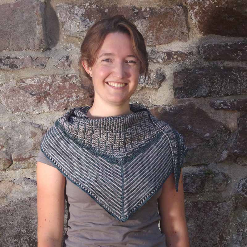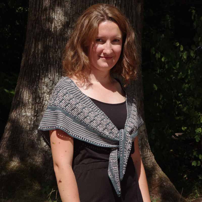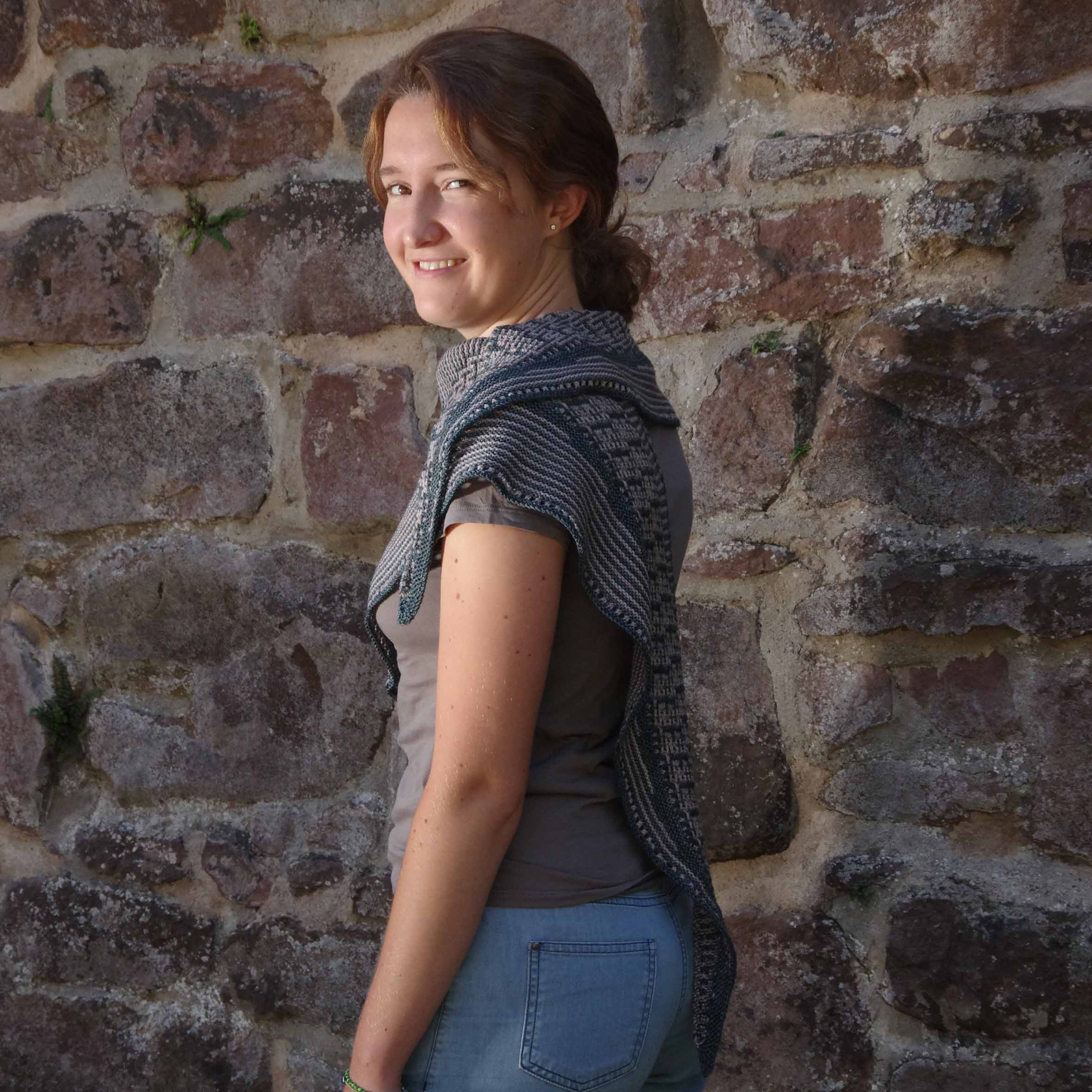 Im Jubiläumsjahr habe ich mich mit den Formen des Bauhaus beschäftigt, ein mehrarmiger Leuchter hat mich zu diesem Muster inspiriert. Das grafische Muster gefällt mir sehr. Hebemaschenmuster sind eigentlich nicht schwer zu stricken. Mein Muster ist leider von der Art, dass man leicht die Übersicht beim Stricken verliert, da der Rapport recht breit ist – und in sich an verschiedenen Stellen symmetrisch, aber versetzt. Der Schal ist nicht groß, wegen der dünnen Wolle, die große Maschenzahl dieses Schals würde mich wirklich interessieren …