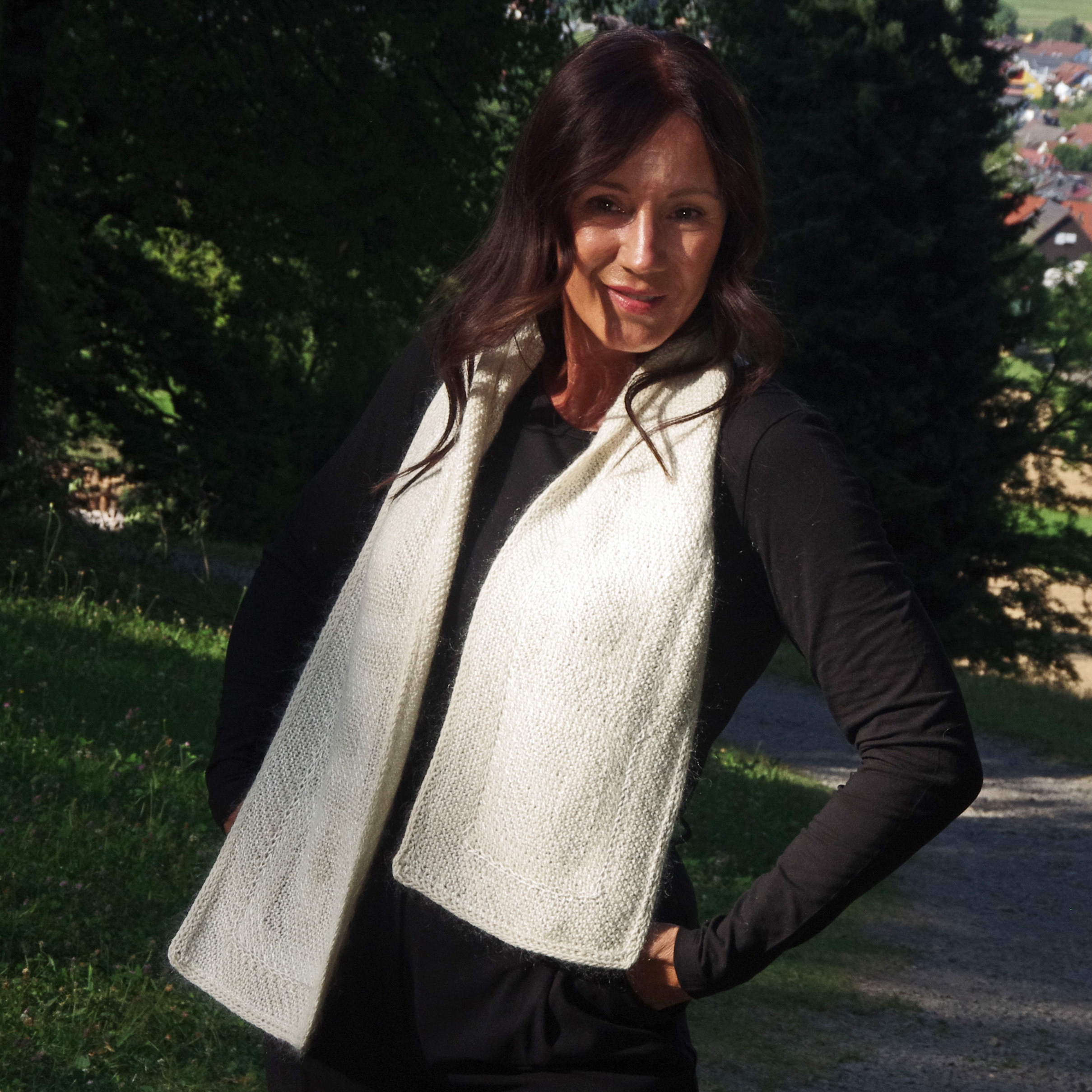 Wegen meiner „Edelsteinserie“ habe ich mir viele Gedanken zu weißen Schmucksteinen wie Diamant und Bergkristall gemacht – wie kann ich einen schönen Schal so ganz ohne Farbkontrast in meinen sonst zweifarbigen grafischen Mustern designen? Geht das mit meinem geliebten „Chiaras Squares“-Muster, das mit den richtigen Garnen gestrickt eine unglaubliche Tiefenwirkung erzeugt ? Schaffe ich es den Kontrast zwischen Glanz/Matt/Glatt/Flausch so stark zu wählen, dass ein schöner Schal entsteht?