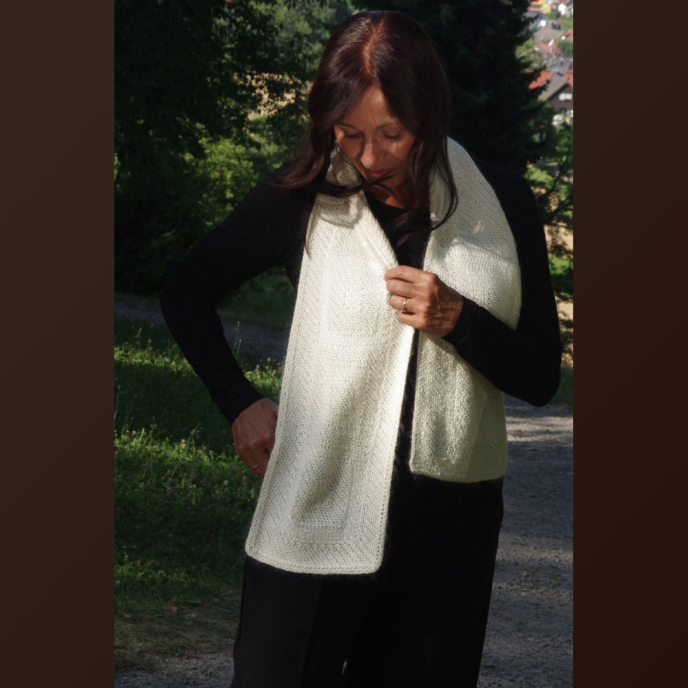 Weißer eleganter Schal (von mir für Dich) gestrickt im Muster meiner Design-Serie: „Chiaras Squares“.