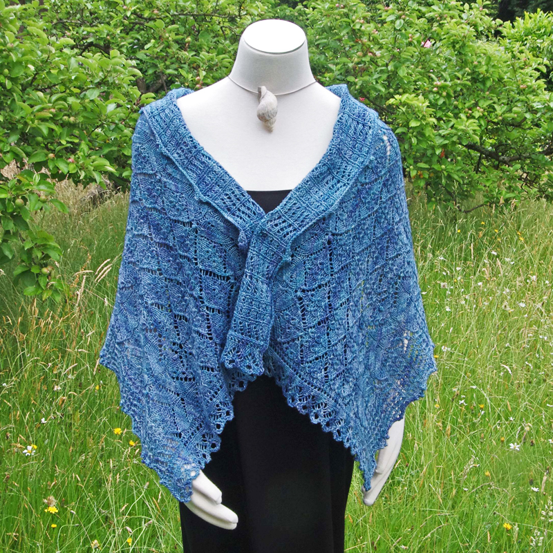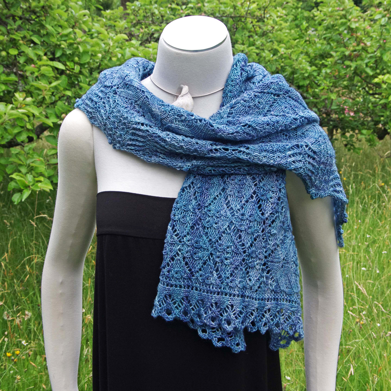 Das Flächenmuster des Schals ist aus einem bekannten leicht variierten Ajourmuster – an den Stirnseiten habe ich eine passende Borte dazu kreiert.