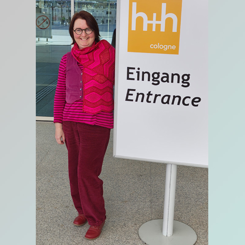 Dies ist mein erster Schal dieser Serie. Ich habe ihn bewusst kratzfrei & tierhaarfrei gestrickt. Er ist warm – stabil, nicht fließend durch die viele BW – dadurch hält er bis zu den Ohren warm (fließende Schals rutschen immer in den Nacken). Ihr habt ihn vielleicht schon auf Social Media gesehen: dort hatte ich ihn auf der h&h-Messe in Köln zum Präsentieren der neuen Stricktechnik dabei und für ein Foto am Eingang der „grauen“ Halle kurz an.