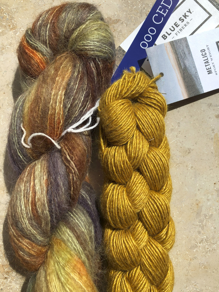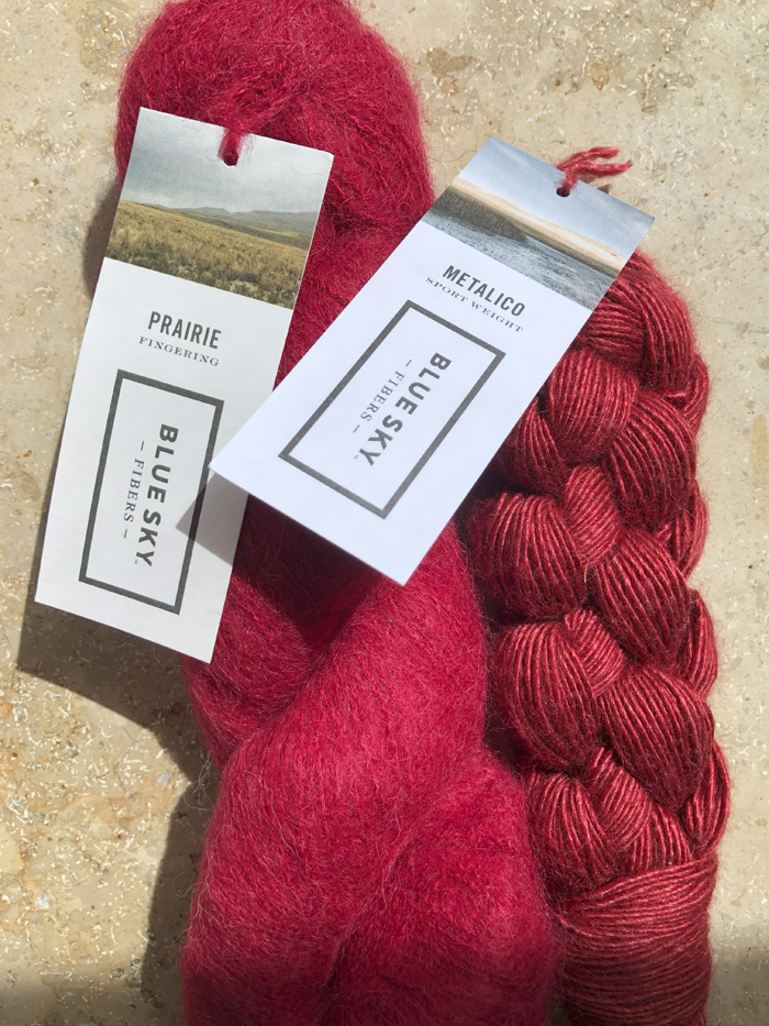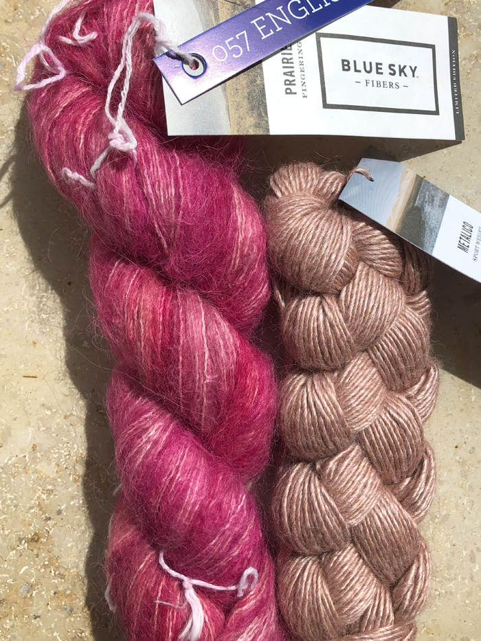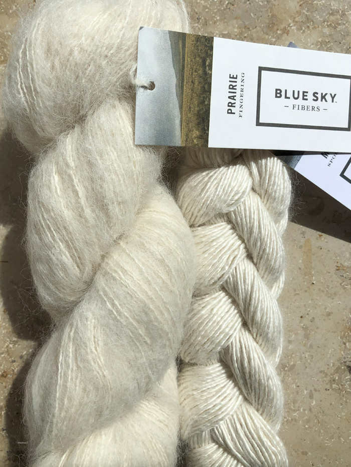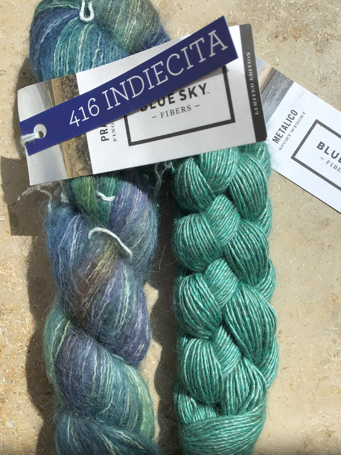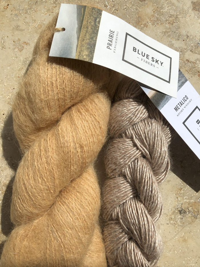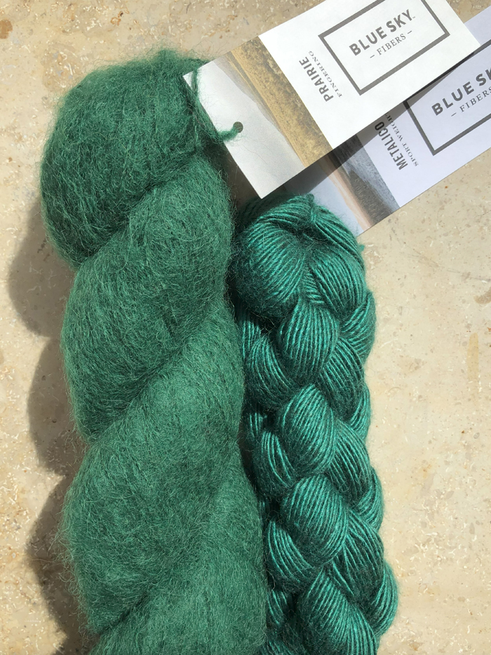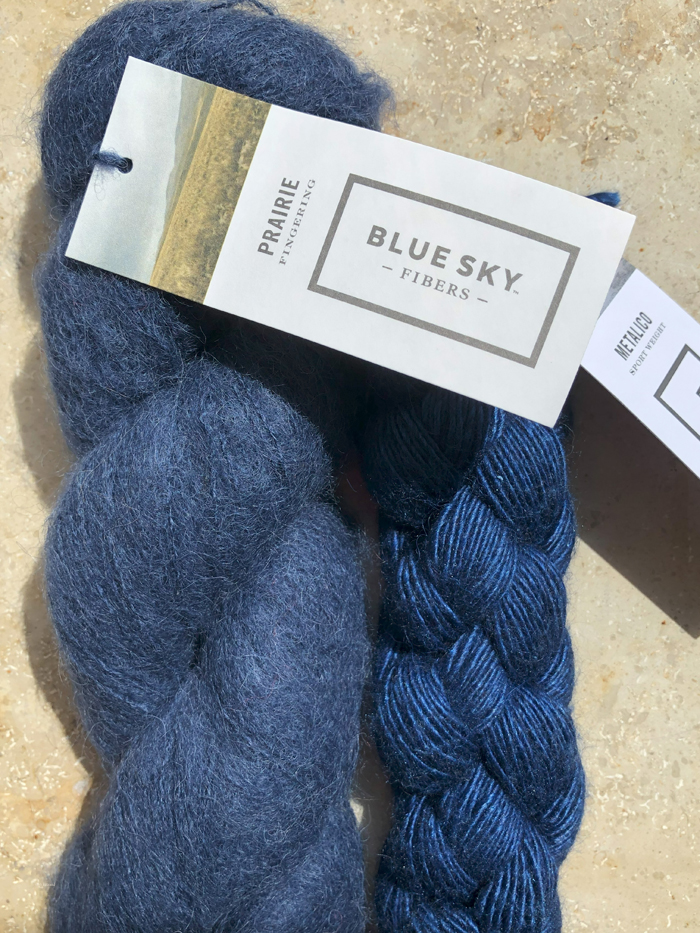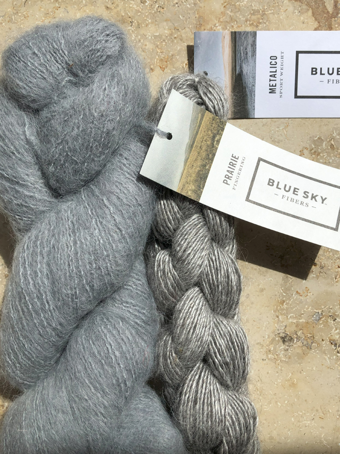 Die Anleitung per PDF und insgesamt 350 g Metalico und Prairie von Blue Sky Fibers in zwei Farben Deiner Wahl. Der fertig gestrickte Kuschel-Schal wiegt ca. 300 g.