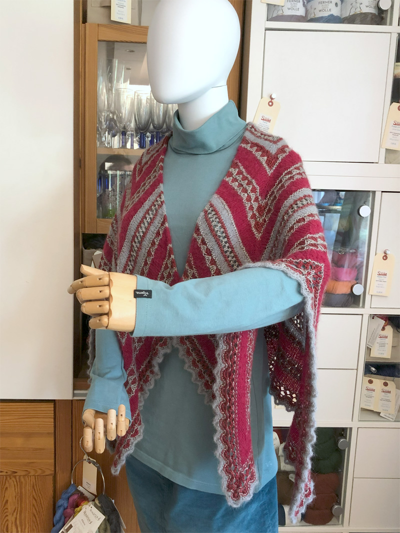 Du strickst von der Mitte nach Außen, die Randmaschen stabilisieren schon beim Stricken die Vorderkanten des Schals.