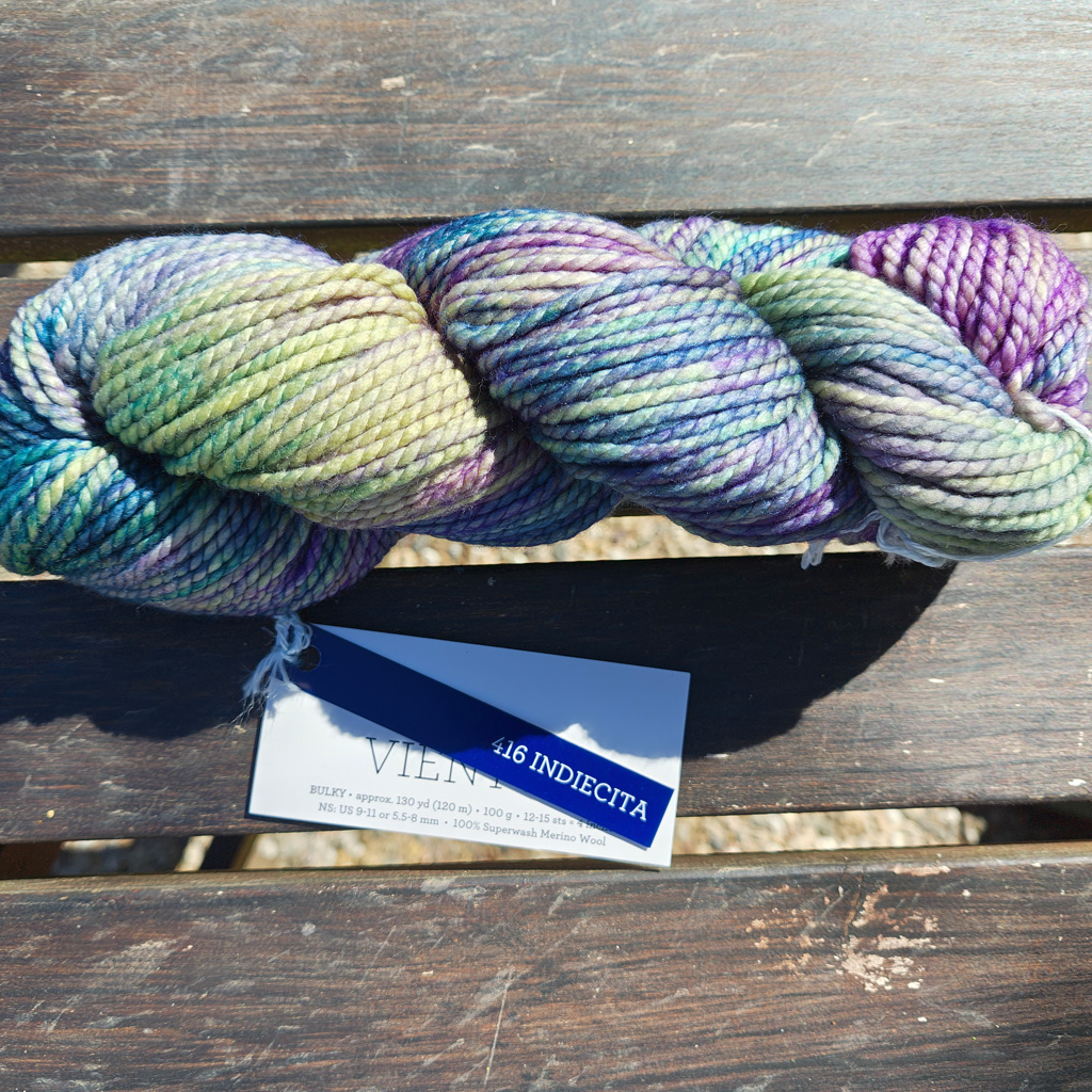Handgefärbte Variante als Dochtgarn, ebenfalls „bulky“ ( gleiche Dicke & Lauflänge9, auch superwash findest Du hier: Mecha