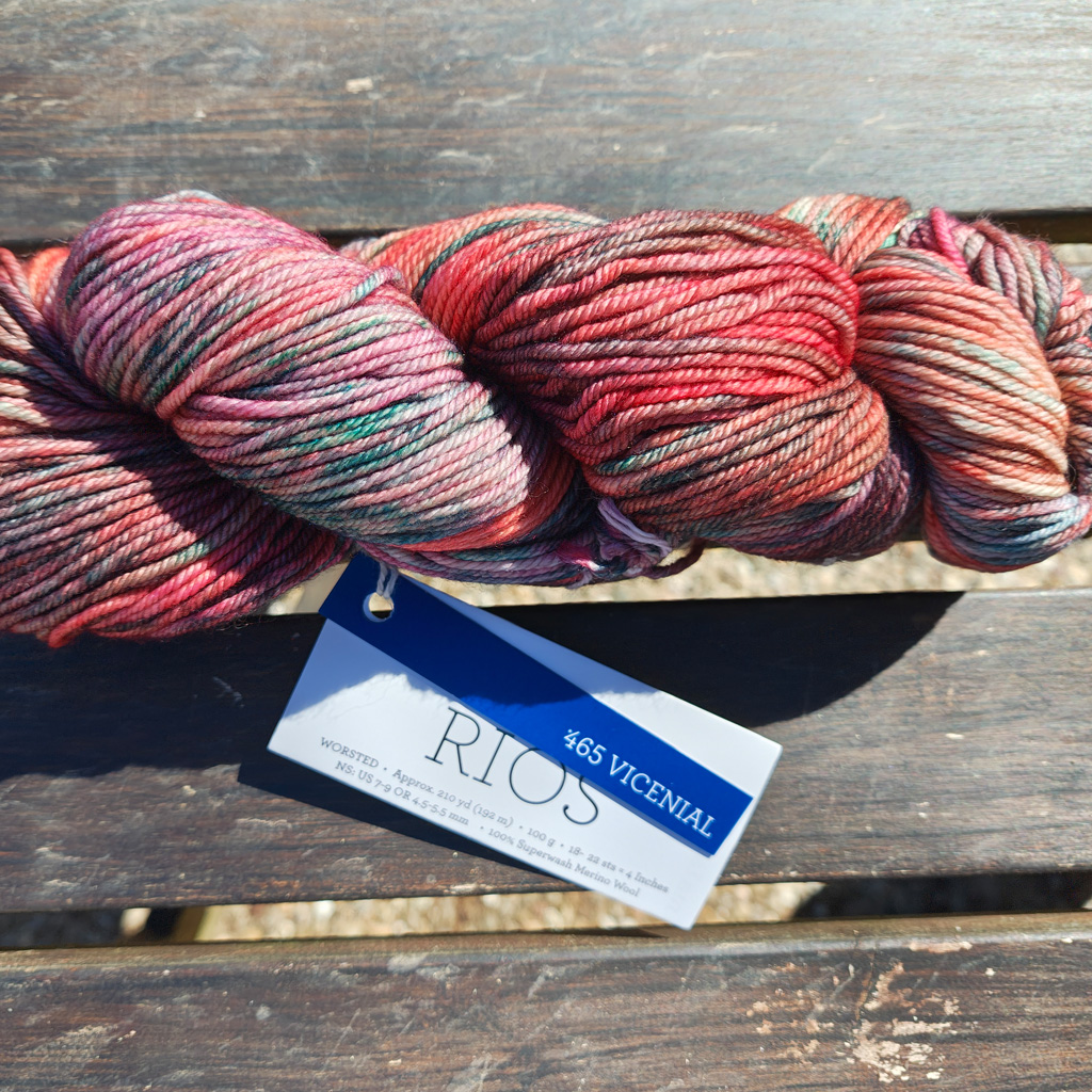 Neue Sorte von meiner geliebten weitgereisten südamerikanischen handgefärbten Feinmerino Wolle von malabrigo. Auf der Messe habe ich sie entdeckt und gleich bestellt. Ein paar meiner StrickStrandDesigns von 2025 findet Ihr auf dem Foto: Mütze, Barett und Cowl sind aus Vientos, der Pulli ist aus Rios im gleichen Farbbad.